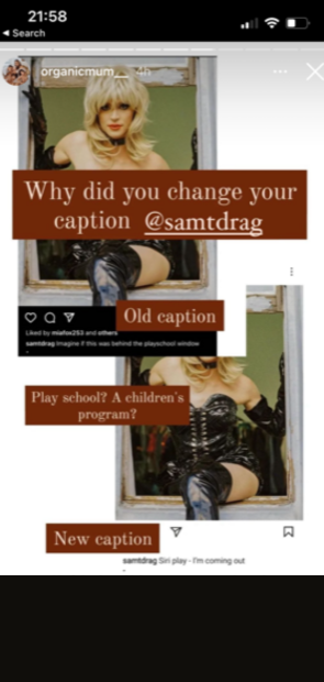 In another he’s dressed like a dominatrix with one thigh high booted leg hanging out of a window frame. The caption reads “imagine if this was behind the playschool window”. End quote. At some point, probably once there was media attention on him, it must’ve dawned on Sam that this wasn’t a good look for someone wanting to read books to children. So he changed the caption to “I’m coming out”.