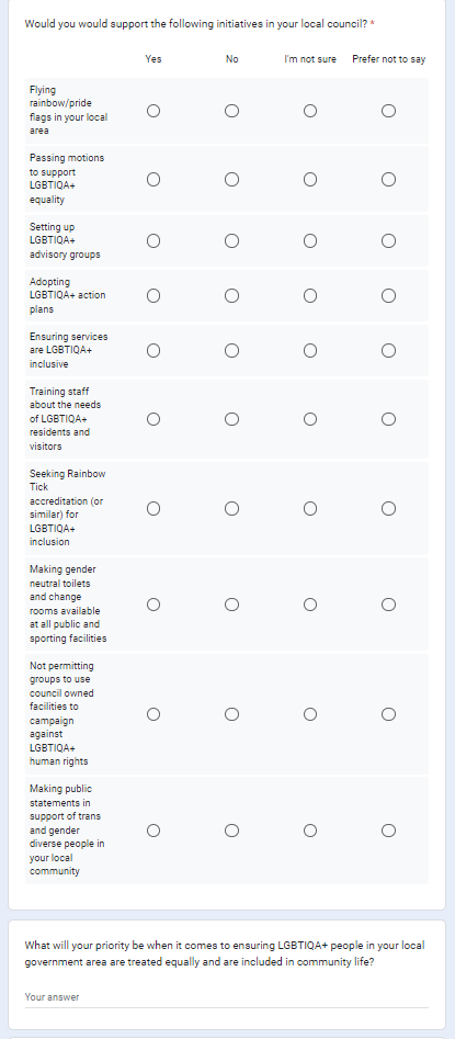 Stassja Frei: Victoria isn’t the only hotbed of local council trans activism. It’s happening right across Australia. For example, Equality Tasmania, an LGBT+ organisation tried a similar scheme to Sean Mulcahy’s Rainbow Local Government program. For the 2022 council elections they asked all candidates a series of LGBT+ related questions, including whether they would support their council obtaining Rainbow Tick Accreditation.